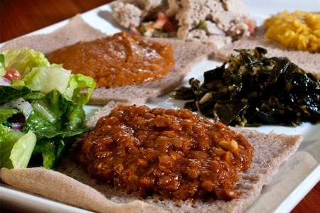 Traditional ethiopian banquet with wine at abyssinian 2 people for $29 or 4 people for $55 dive into any 3 meat dishes and any 3 vegetarian dishes to share per 2 diners: kay wot (red chilli pepper lamb) beef tibs (black pepper beef)