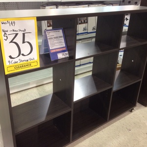 Get the 9 Cube shelf with coasters at half the price. The quality of the 9 Cube shelf with coasters seems good with coaster wheels to move easily. These are on clearance at Glebe Officeworks and these seems to be a really good bargain as the clearance sticker says it was $149 and the label price says $74.50. So most likely it was 50% before of $149 ( hence $74.50 ) and now is on further clearance at $35. To complete the set you can also get some cube boxes to fill it up the slots . You can find them at the rear left corner of the store and they are on clearance for $3.