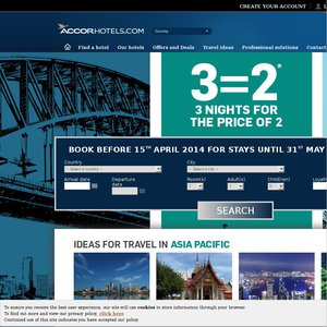 Book for three nights and pay for only two nights at Accorhotels. The offer is open to general public between 25th March and 15th April 2014 and for Accor Advantage Plus members, Le Club Accorhotels card holders and Accorhotels.com subscribers between 18th March and 15th April 2014 ( start and dates are inclusive ). Accor Advantage Plus members receive an extra 10% discount for bookings made in participating hotels in Asia Pacific ( that is a total of 43.33% on savings ). The offer is available on reservations made at least five days in advance. Payment must be made online by card at the time of booking. Terms and conditions apply.