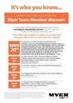 If you are a member of Myer One, you are eligible for their Myer Team member discount on all of their deals! All you have to do is present the discount flyer while you shop. For example: -20% on apparel, accessories, footwear and homewares by BABYWORLD, BASQUE, BLAQ, BLAQ PREMIUM, BROOKLYN INDUSTRIES, CHLOE & LOLA, COLLECTION, COOK’S KITCHEN, COZI BY JENNIFER HAWKINS, HERITAGE, HI THERE FROM KAREN WALKER, INNOVARE, JACK & MILLY, JANE LAMERTON, KENJI, LA DE DA, LEONA BY LEONA EDMISTON, LICORICE, LITTLE LEONA, LOST HIGHWAY, MADDOX, MATICEVSKI. -15% on other women’s, men’s, youth and children’s clothing, intimate apparel, footwear and accessories and homewares including bedlinen, towels, pillows, quilts. -10% on electrical items including televisions, computers, Apple iPods, cameras, fridges, dryers, small appliances. There are exclusions for example: Gift Cards, iTunes Gift Cards, Sony PlayStation network cards, sunglasses, Alan Pinkus, Anthea Crawford, Apple, Asko, Benefit Brow Bar Services, etc.