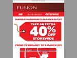 Fusion Fairfield VIC warehouse and store-wide is having a huge clearance sale! To be exact, there location is at 260-262 Darebin Road, Fairfield VIC. You can save up to 40% on all Colorado, Jag and diana ferrari items! I can't help but notice the Colorado shoes are now for $30 after applying the discount of 40%. It was valued for $100 then for $50. Get them now fast because the deal starts on February 17, 2011 and ends on March 6, 2011. You can't combine the bargain with other discounts and it is not applicable for those brands mentioned above at major shopping malls, independent retailers or concept stores. You can't ask for refunds or apply it for previous orders, laybys and gift vouchers. You are welcomed to them as a new Fusion member for free.