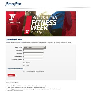 Fitness First is celebrating Australia Fitness Week and is giving a free gift . Get free entry for Australia Fitness Week from Fitness First. Stay fit and healthy by taking charge of your health. As much as food and rest are important, physical activities also play a great role in keeping our body and our mid healthy. The free entry is valid for first time visitors and local residents 16 years and older only. The 7 day pass entitles the named person to a guest membership at selected Fitness First Clubs. Only 1 free pass can be used per person and photo ID is required for entry. Terms and conditions apply.