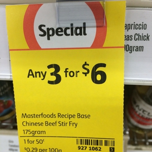 Oz Bargain is bringing us good news from Coles Coburg . Coles Coburg is having a sale and is offering a great deal on their Masterfoods 175 g Recipe Base . Coles Coburg is having the " 3 for $6 " offer for their Masterfoods 175 g Recipe Base and this is the perfect time for you to grab one of these and make wonderful dishes for your family and friends . They are scanning at the register as $0.50 each, no matter how many you buy so grab one now and choose among delectable flavors such as Country beef casserole , Apricot chicken, Chinese beef, Satay chicken and Oven Easy Honey BBQ chicken .