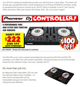 Get $100 off Pioneer DJ Controller at JB Hi-Fi in-Store . The Pioneer DJ Controller is normally sold at the price of $322 but with this great offer from JB Hi-Fi in-Store you can get the fantastic Pioneer DJ Controller for only $222 . Party all you want and mix great sounds with this controller without having to pay too much. With this offer using the voucher that gives you $100 off you get a pretty much better deal than that of Dick Smith, Store DJ and Lightsounds. This Exclusive Voucher can be used at any JB Hi-Fi Store in Australia and a limit of 1 per voucher applies. Offer is good while stocks last. Offer ends Sunday 5th October 2014.