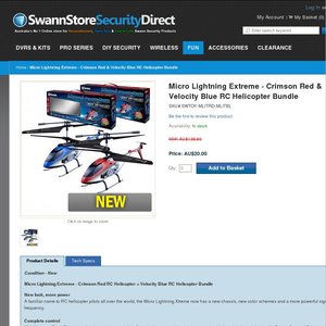 Great news for all those RC fans out there! Micro Lightning Extreme-Crimson Red RC Helicopter plus Velocity Blue RC Helicopter Bundle for the price of $139.90 Enjoy these RCs with their new chassis, new color schemes, a more powerful signal frequency, complete control with Swann's Easy-Fly gyro technology and powerful 2.4GHz wireless control. You will be delighted with the 6-way multi directional precision for up and down and forward and backward and left and right movements with ease. This is very simple to operate with a very realistic performance. This Micro Lightning Xtreme is specialized and lightweight construction, easy to fly, built for indoor flying and can withstand impacts and crashes. It is also quick charging. You can play with it again in less than an hour. Batteries are 4 x AA. So come to Swannstore and buy these RCs now!