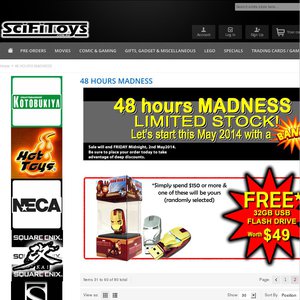 Crazy Sale happening at Scifitoys! I checked out their website and they have major discounts in a lot of their items! If you are into weird science or any geeky toys then you will definitely love this sale happening there now! I bought a lot of Doctor Who and Star Wars stuff at almost half the price! Spend over $150 and you get a cool 32GB Iron Man USB Flash Drive. There's an additional $13 for shipping but with all the coll stuff you'll have you wouldn't mind spending more for shipping. They have a lot more items on sale and you can check out Scifitoys for more deals!