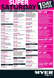 Get big discounts on mens clothing and apparel during all the Saturday's of the month only at Myer's. 40% discounts on brands like Blaq, Brave by Wayne Cooper, Mossimo, Kenji, Bauhaus, Maddox, Lost Highway, Reserve, Elwood, Trent Nathan, Jeff Banks and Jack Stone. while 30% Off on brands like Jag, Calvin Klein Jeans, Brooksfield, Peter Werth, Suoerdry, Republic, Tommy Hilfiger, Gazman, Blazer, Nautica, Henley's. M-One and Deacon. 20% Off on Bluray players, recorders and also 20% Off on our Easter Shop products. Discount only applies to our online checkout facilities, terms and conditions will apply. Come visit us and enjoy big discounts on almost all our brands, see you there!