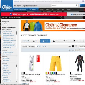 Chain Reaction Cycles, Australia's leading clothes retailer, is having a Monter Clearance Sale. get up to 70% OFF on tshirts, sleeveless tops and tights. Check this out. The Skins A100 Sleeveless Top sells for only $12.99. Tshirts of various sizes and colours sell for only $10. Even the Skins A100 Tights go for only $17.99. There's something for everyone, and best of, your orders are delivered FREE. So check out their long list of clothes. Order one for the entire family and save 70% OFF the regular retail price. Avoid long queues, just have your orders delivered, FREE, only from Chain Reaction Cycles.