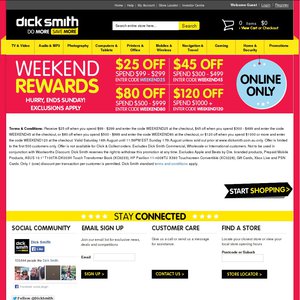 Planning to but something online this weekend? Visit dicksmith.com and see if they have what you're looking for. Dick Smith is running a promotion only for this weekend. For online purchases totaling $99 to $299, you will get a rebate of $25. $45 OFF when the total reaches $300-$499. That is a savings of up to 25%. The more you spend, the bigger the cash back is. For purchases from $500 to $999, get an $80 rebate and $120 for purchases of more than $1000. That's extra savings, considering that Dick Smith has already the lowest priced items compared with other stores. So check out dicksmith.com and save yourself up to 25% OFF.